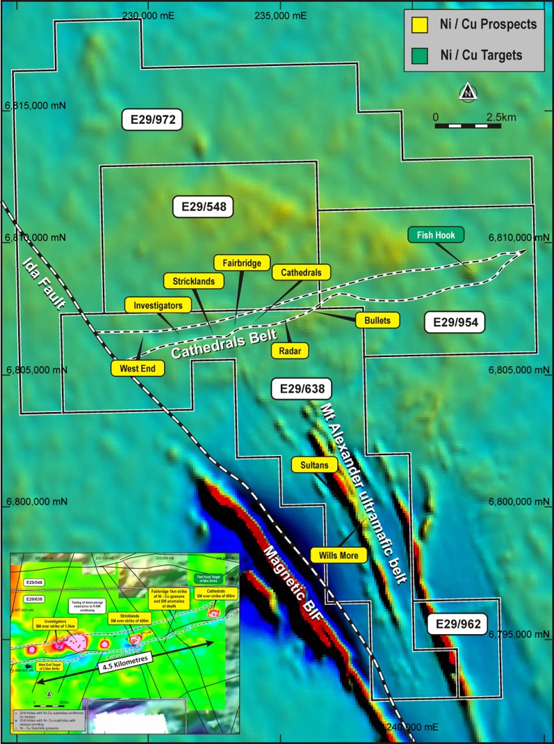 The figure below is a plan view of the of the Cathedrals Belt (over TMI magnetics) showing key prospects.