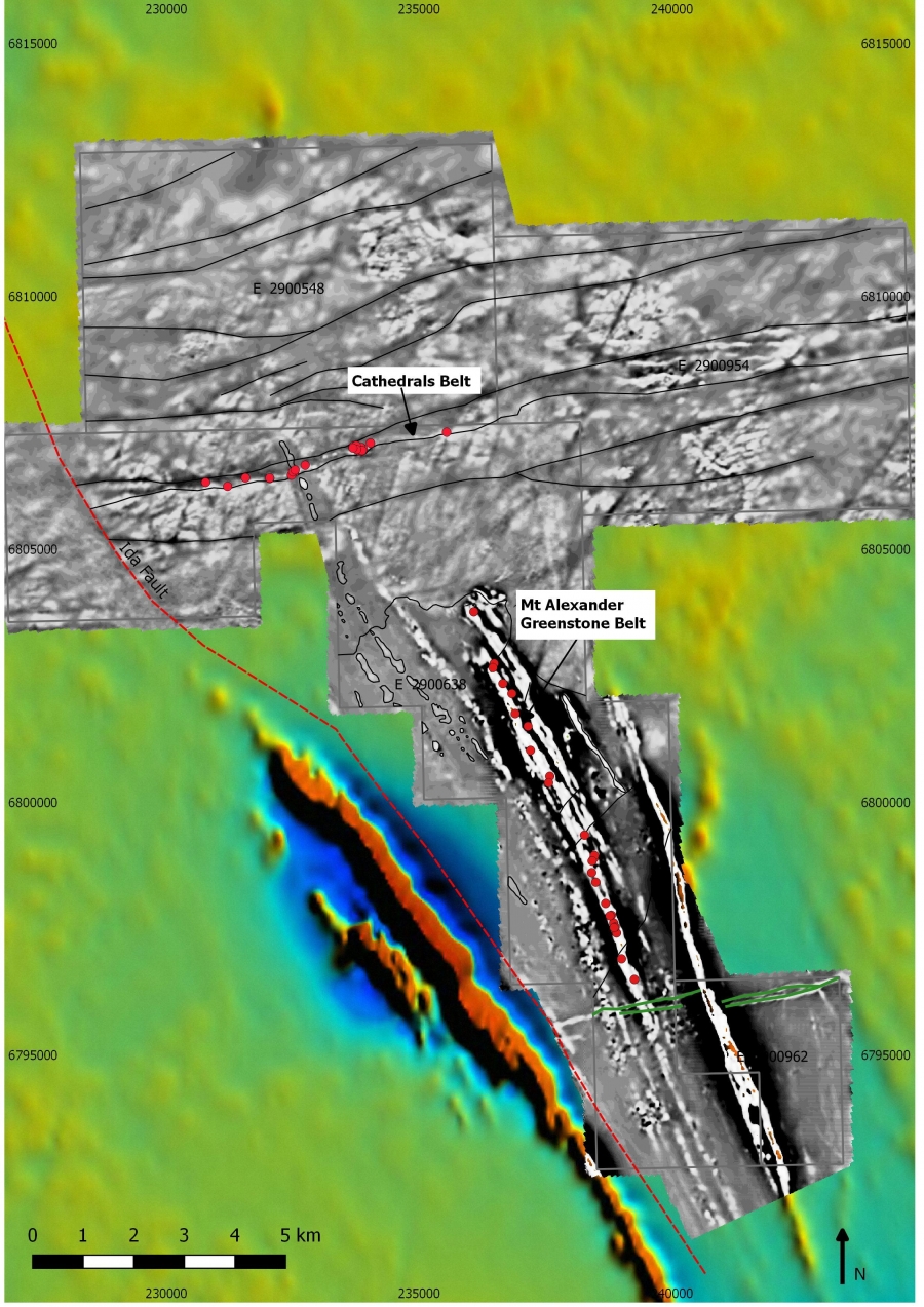 The Mt Alexander Belt trends north-northwest, the typical orientation of greenstone belts in Western Australia’s Yilgarn Craton.